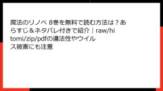 女性マンガ・コミック 魔法のリノベ 8巻を無料で読む方法は?あらすじ&ネタバレ付きで紹介|raw/hitomi/zip/pdfの違法性やウイルス被害にも注意 魔法のリノベ 8巻 詳細あらすじレビュー:家族の絆をリノベで深める感動のエピソードこんにちは、漫画好きのブロガーです! 今回取り上げるのは、星崎真紀先生の人気作『魔法のリノベ』の最新巻、第8巻。リノベーションを通じて家族の心を繋ぐ、心温まる... 2025.12.16 女性マンガ・コミック魔法のリノベ