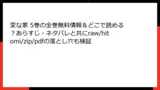 変な家 変な家 5巻の全巻無料情報&どこで読める?あらすじ・ネタバレと共にraw/hitomi/zip/pdfの落とし穴も検証 変な家 5巻のあらすじ詳解人気ミステリー漫画『変な家』の5巻は、片淵家の暗い秘密が遂に明かされる完結編的な位置づけです。これまでの謎が次々と解明され、家族の絆と呪いの連鎖が交錯するストーリーが展開します。以下では、物語の流れを詳しく追いなが... 2025.12.22 変な家青年マンガ・コミック