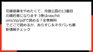 女性マンガ・コミック 花嫁修業をやめたくて、冷徹公爵の13番目の婚約者になります 3巻はraw/hitomi/zip/pdfで読める?全巻無料でどこで読めるか、あらすじ&ネタバレも最新情報チェック 花嫁修業をやめたくて、冷徹公爵の13番目の婚約者になります 3巻 詳細あらすじこの人気シンデレラ・ラブストーリーの第3巻では、没落令嬢イリアと冷徹公爵エリオットの関係がさらに深みを増していきます。政略結婚から始まった二人の物語が、互いの苦労... 2025.12.23 女性マンガ・コミック花嫁修業をやめたくて、冷徹公爵の13番目の婚約者になります