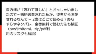 女性マンガ・コミック 貴方様が「忘れてほしい」とおっしゃいましたので~婚約破棄された私が、従者から溺愛されるなんて~ 2巻はどこで読める?あらすじやネタバレ、全巻無料で読む方法も検証(rawやhitomi、zip/pdf利用のリスクも解説)