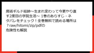 少年マンガ・コミック 魔術ギルド総帥~生まれ変わって今更やり直す2度目の学院生活~ 1巻のあらすじ・ネタバレをチェック!全巻無料で読める場所は?raw/hitomi/zip/pdfの危険性も解説 FAIRY TAIL 100 YEARS QUEST 2巻のあらすじナツやルーシィたちフェアリーテイルのメンバーたちが、100年クエストに挑む冒険譚の第2巻。強力な敵や新たな仲間との出会いが描かれ、物語が加速します。クエストの始まりと新たな... 2026.01.10 少年マンガ・コミック魔術ギルド総帥~生まれ変わって今更やり直す2度目の学院生活~