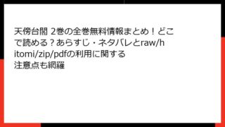 天傍台閣 天傍台閣 2巻の全巻無料情報まとめ!どこで読める?あらすじ・ネタバレとraw/hitomi/zip/pdfの利用に関する注意点も網羅 天傍台閣 2巻の詳細あらすじ弓庭史路による人気漫画「天傍台閣」の第2巻は、禍獣の脅威がさらに激化する中、主人公・藤哉の活躍を中心に描かれています。この巻では、大規模な侵蝕事件が発生し、組織内の混乱と権力争いが浮き彫りになります。以下では、物... 2026.01.26 天傍台閣少年マンガ・コミック