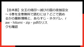 【合本版】女王の烙印~滅びの国の夜伽巫女~ 【合本版】女王の烙印~滅びの国の夜伽巫女~ 6巻を全巻無料で読むには?どこで読めるかの最新情報と、あらすじ・ネタバレ、raw・hitomi・zip・pdfのリスクも確認 【合本版】女王の烙印~滅びの国の夜伽巫女~ 6巻の詳細なあらすじ加藤キャシーによるエロティックホラー漫画『女王の烙印~滅びの国の夜伽巫女~』の合本版6巻は、原作の26巻から30巻をまとめた内容です。この巻では、物語がさらに深みを増し、主人公... 2026.02.02 【合本版】女王の烙印~滅びの国の夜伽巫女~女性マンガ・コミック