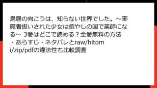 少女マンガ・コミック 鳥居の向こうは、知らない世界でした。~邪魔者扱いされた少女は癒やしの国で薬師になる~ 3巻はどこで読める?全巻無料の方法・あらすじ・ネタバレとraw/hitomi/zip/pdfの違法性も比較調査 鳥居の向こうは、知らない世界でした。~邪魔者扱いされた少女は癒やしの国で薬師になる~ 3巻 あらすじ詳細ストーリーの全体像この3巻では、主人公の千歳が異世界「千国」の薬局・水仙堂で薬師としての生活に徐々に慣れていく様子が描かれます。物語は、... 2026.02.04 少女マンガ・コミック鳥居の向こうは、知らない世界でした。~邪魔者扱いされた少女は癒やしの国で薬師になる~