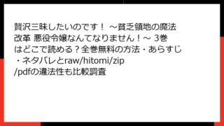 女性マンガ・コミック 贅沢三昧したいのです! ~貧乏領地の魔法改革 悪役令嬢なんてなりません!~ 3巻はどこで読める?全巻無料の方法・あらすじ・ネタバレとraw/hitomi/zip/pdfの違法性も比較調査 贅沢三昧したいのです! ~貧乏領地の魔法改革 悪役令嬢なんてなりません!~ 3巻 あらすじこの人気マンガの3巻では、主人公のサレスティアがさらに領地改革を進めながら、ゲームの運命に抗う冒険が深みを増します。転生した悪役令嬢として貧乏生活を脱... 2026.02.07 女性マンガ・コミック贅沢三昧したいのです! ~貧乏領地の魔法改革 悪役令嬢なんてなりません!~