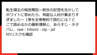 少年マンガ・コミック 転生領主の優良開拓~前世の記憶を生かしてホワイトに努めたら、有能な人材が集まりすぎました~ 1巻を全巻無料で読むには?どこで読めるかの最新情報と、あらすじ・ネタバレ、raw・hitomi・zip・pdfのリスクも確認