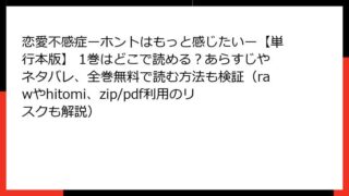 女性マンガ・コミック 恋愛不感症ーホントはもっと感じたいー【単行本版】 1巻はどこで読める?あらすじやネタバレ、全巻無料で読む方法も検証(rawやhitomi、zip/pdf利用のリスクも解説) 恋愛不感症ーホントはもっと感じたいー【単行本版】 1巻のあらすじ詳解この記事では、人気コミック「恋愛不感症ーホントはもっと感じたいー」の単行本版1巻について、詳細なあらすじをブログ形式でお届けします。派手な外見が原因で誤解されやすい主人公の... 2026.02.15 女性マンガ・コミック恋愛不感症ーホントはもっと感じたいー【単行本版】