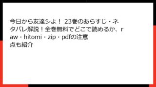今日から友達シよ! 今日から友達シよ! 23巻のあらすじ・ネタバレ解説!全巻無料でどこで読めるか、raw・hitomi・zip・pdfの注意点も紹介 今日から友達シよ! 23巻のあらすじ詳解人気のタテヨミ漫画「今日から友達シよ!」の23巻について、詳しく掘り下げてみましょう。このシリーズは、失恋した主人公が腐れ縁の友達との関係が意外な方向へ進む様子を描いたラブコメディで、ドキドキする展開... 2026.02.23 今日から友達シよ!青年マンガ・コミック