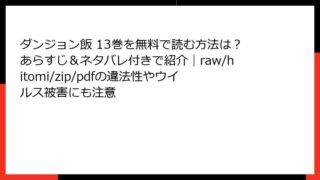 ダンジョン飯 ダンジョン飯 13巻を無料で読む方法は?あらすじ&ネタバレ付きで紹介|raw/hitomi/zip/pdfの違法性やウイルス被害にも注意 ダンジョン飯 13巻 あらすじ詳解人気漫画「ダンジョン飯」の13巻は、物語のクライマックスを迎える重要な巻です。迷宮の深淵で繰り広げられる冒険者たちの戦いが、悪魔の欲望と交錯し、世界の運命を賭けたバトルが展開されます。ここでは、巻全体のあら... 2026.03.01 ダンジョン飯青年マンガ・コミック