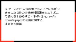 BLゲームの主人公の弟であることに気がつきました BLゲームの主人公の弟であることに気がつきました 3巻の全巻無料情報まとめ!どこで読める?あらすじ・ネタバレとraw/hitomi/zip/pdfの利用に関する注意点も網羅 BLゲームの主人公の弟であることに気がつきました 3巻 あらすじ詳解物語の全体像この作品は、前世で熱心な腐女子だった主人公が、愛してやまなかったBLゲームの世界に転生するというユニークな設定が魅力のコミックです。主人公は最初、自分がゲームの... 2026.03.08 BLゲームの主人公の弟であることに気がつきました女性マンガ・コミック