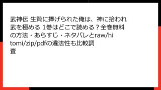 少年マンガ・コミック 武神伝 生贄に捧げられた俺は、神に拾われ武を極める 1巻はどこで読める?全巻無料の方法・あらすじ・ネタバレとraw/hitomi/zip/pdfの違法性も比較調査 武神伝 生贄に捧げられた俺は、神に拾われ武を極める 1巻 あらすじ0"LARGE"この漫画は、異世界ファンタジー要素を交えたアクション満載の物語です。原作は美紅氏によるライトノベルで、作画は木友奏多氏が担当。主人公の逆転劇が魅力的に描かれて... 2026.03.11 少年マンガ・コミック武神伝 生贄に捧げられた俺は、神に拾われ武を極める
