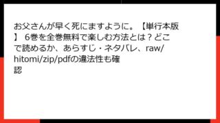 お父さんが早く死にますように。【単行本版】 お父さんが早く死にますように。【単行本版】 6巻を全巻無料で楽しむ方法とは?どこで読めるか、あらすじ・ネタバレ、raw/hitomi/zip/pdfの違法性も確認 『お父さんが早く死にますように。』【単行本版】6巻 衝撃の詳細あらすじを徹底深掘り! 絶望の底から見える狂気の予感裏海マユ先生の衝撃作『お父さんが早く死にますように。』。近所で「仲良し姉妹」と評判のあすかと蛍が抱える、誰にも言えない家庭の闇... 2026.03.14 お父さんが早く死にますように。【単行本版】青年マンガ・コミック