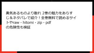 勇気あるものより散れ 勇気あるものより散れ 2巻の魅力をあらすじ&ネタバレで紹介!全巻無料で読めるサイトやraw・hitomi・zip・pdfの危険性も検証 勇気あるものより散れ 2巻:不死の少女と死に損ないの武士が繰り広げる逃走と犠牲の明治浪漫譚相田裕氏による伝奇剣戟アクション『勇気あるものより散れ』。明治七年を舞台に、不死の一族「化野民」の血を引く少女・九皐シノと、幕末を生き残った元会津藩士... 2026.03.15 勇気あるものより散れ青年マンガ・コミック